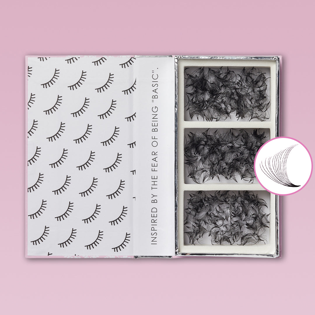 iLevel Lab Vegan 14D Pro Made Volume Fans are hand made by our trained team of lash artists to ensure best quality. Speed up your application process with Pro Made Fans- perfect for lash artist who haven't mastered creating volume fans by hand, or artists who want to serve more clients in a day. Made out of the softest fiber, the super thin bases will provide the best bond with the natural lashes, assuring the best retention and results. With 14D Pro Made Fans, applying lashes only takes half the time. With every lash you apply, you get the look of applying 14 lashes.