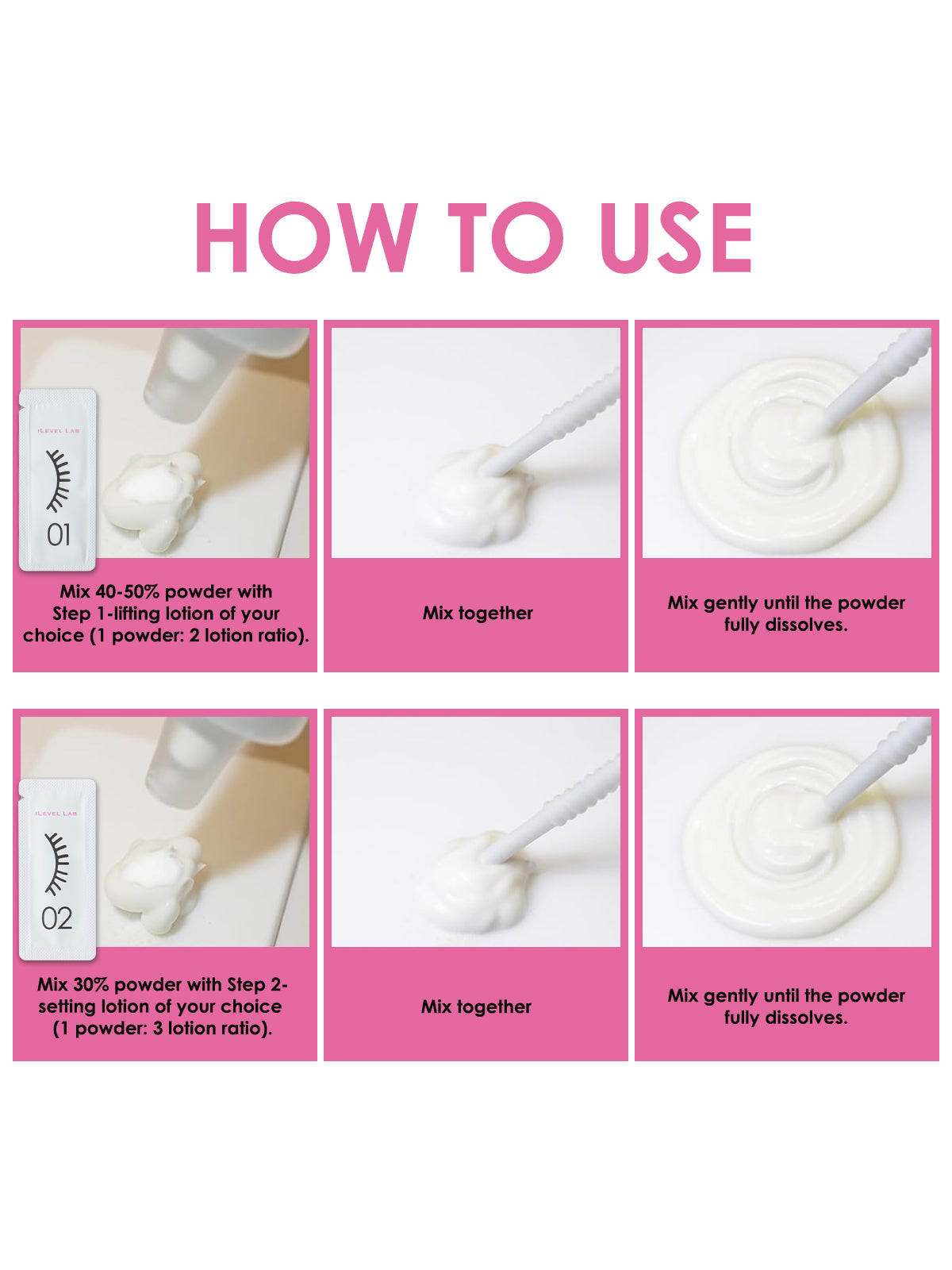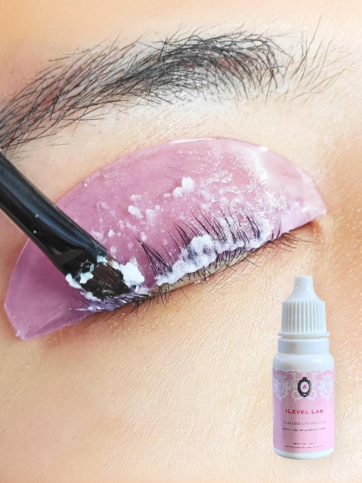 1. Mix 40-50% powder adhesive with iLevel Lab Step 1 - lifting lotion (or a lifting lotion of your choice). 1 powder : 2 lotion ratio. Mix & apply as instructed in manufacturing instructions of your lash lifting lotion.