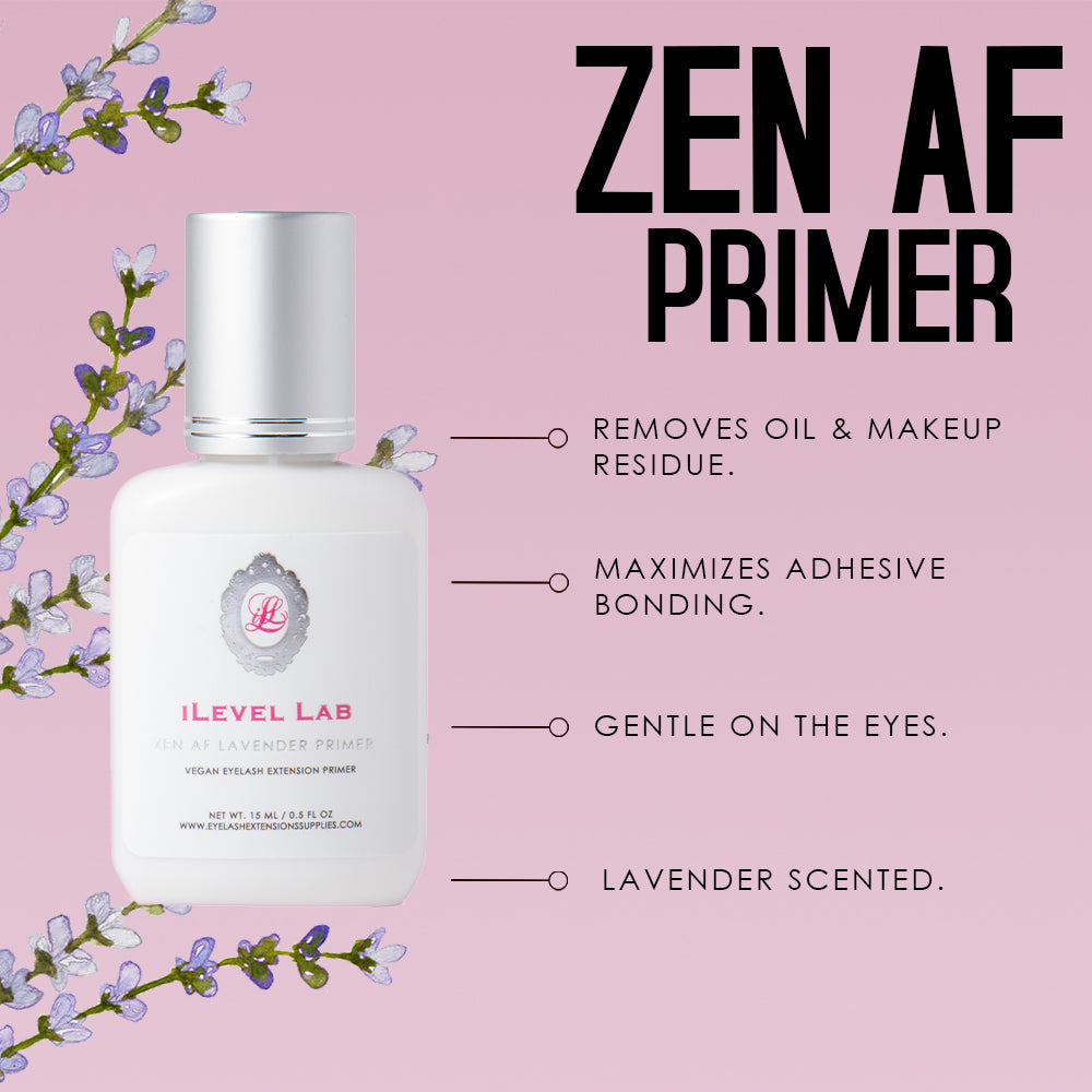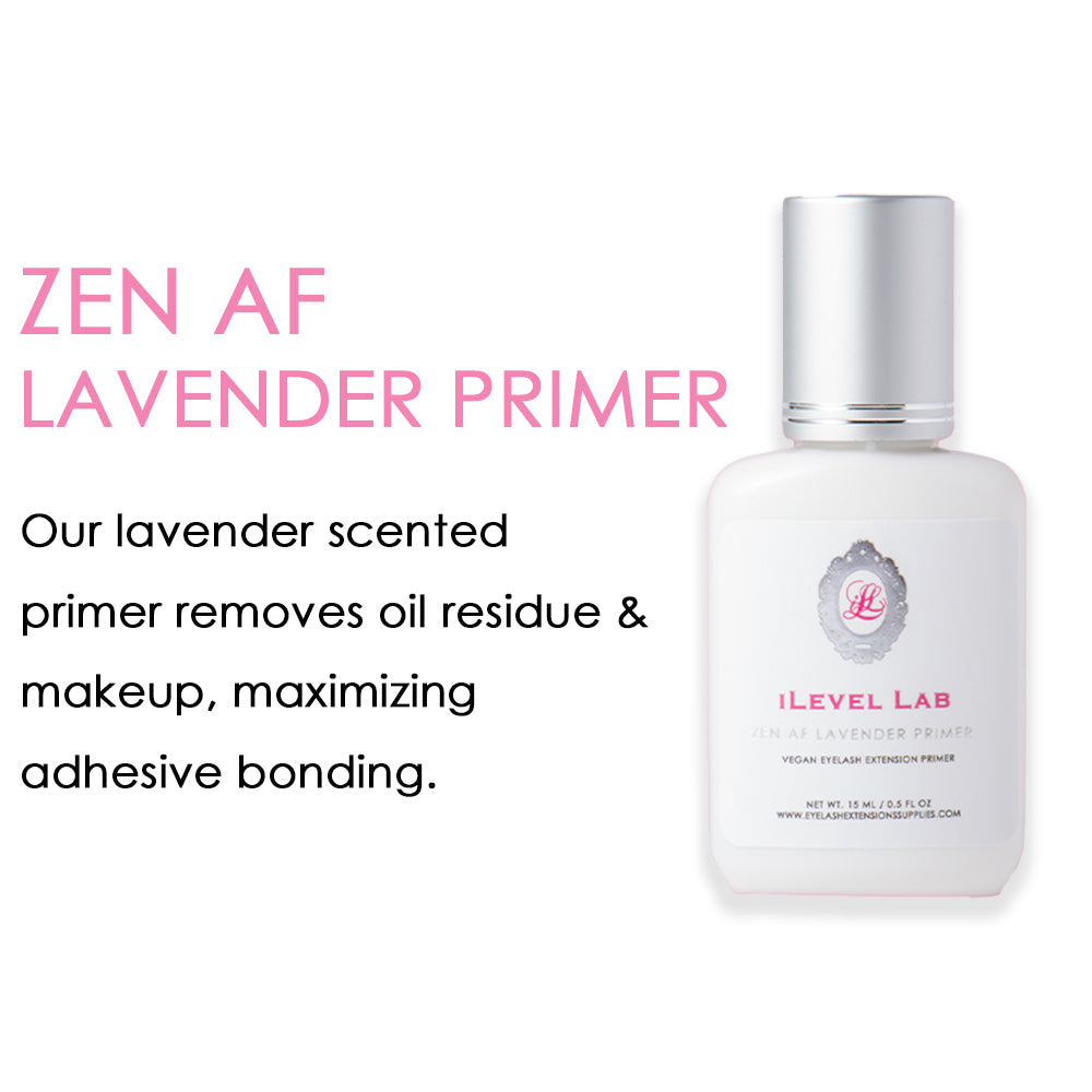 iLevel Lab ZEN AF Eyelash Extension Primer / Pre-Treatment is perfect for priming and disinfecting lashes before application. It is designed to remove residual cosmetics and natural oils for maximum adhesive bonding. This primer has a liquid consistency and safe non-drip formula and it can be used on natural lashes or eyelash extensions, making it ideal for initial application or touch-ups. This primer is lavender scented, for a full ZEN AF spa experience. Intended for Professional Use Only.