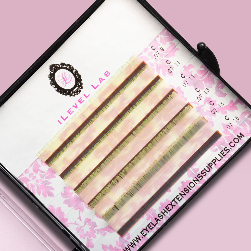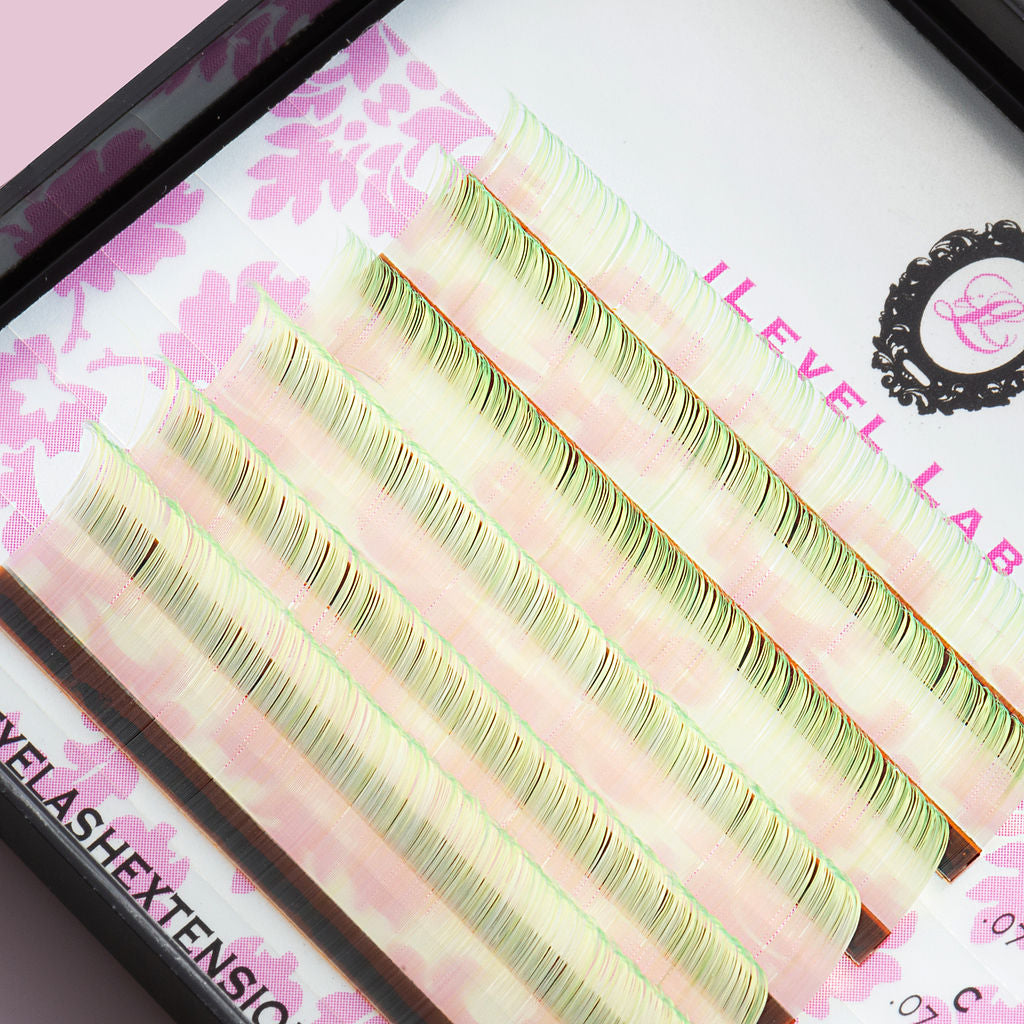 iLevel Lab White-Green Lash Extensions are great for clients who want to add depth and detail to their lash sets. This frosty color adds dimension to any look! Create full color sets or mix in with black lash extensions for a pop of color. Go as bold or as subtle as you like with our white-green lashes for a fun, fashionable statement. Offer your clients something new for their next fill or full set of colored lashes!!