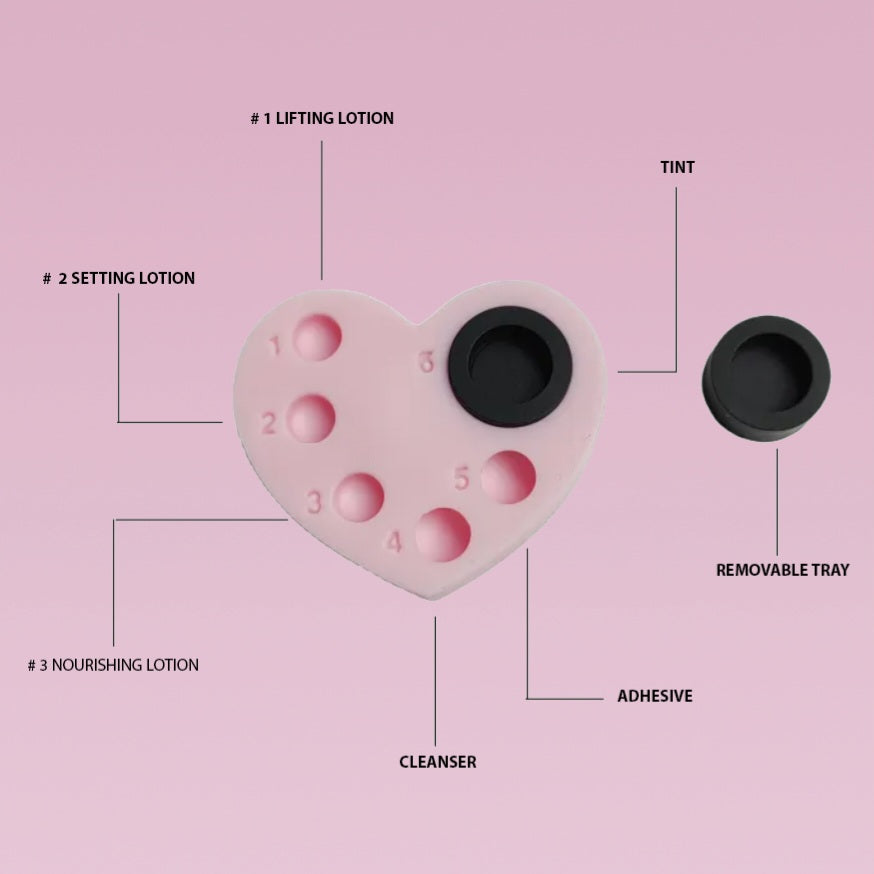 - Each palette has 6 compartments: 3 specially sized slots for lifting, fixing, and nourishing lotions. 2 additional openings to accommodate lash and brow tint. 1 slot is reserved for water and 1 for liquid adhesive.