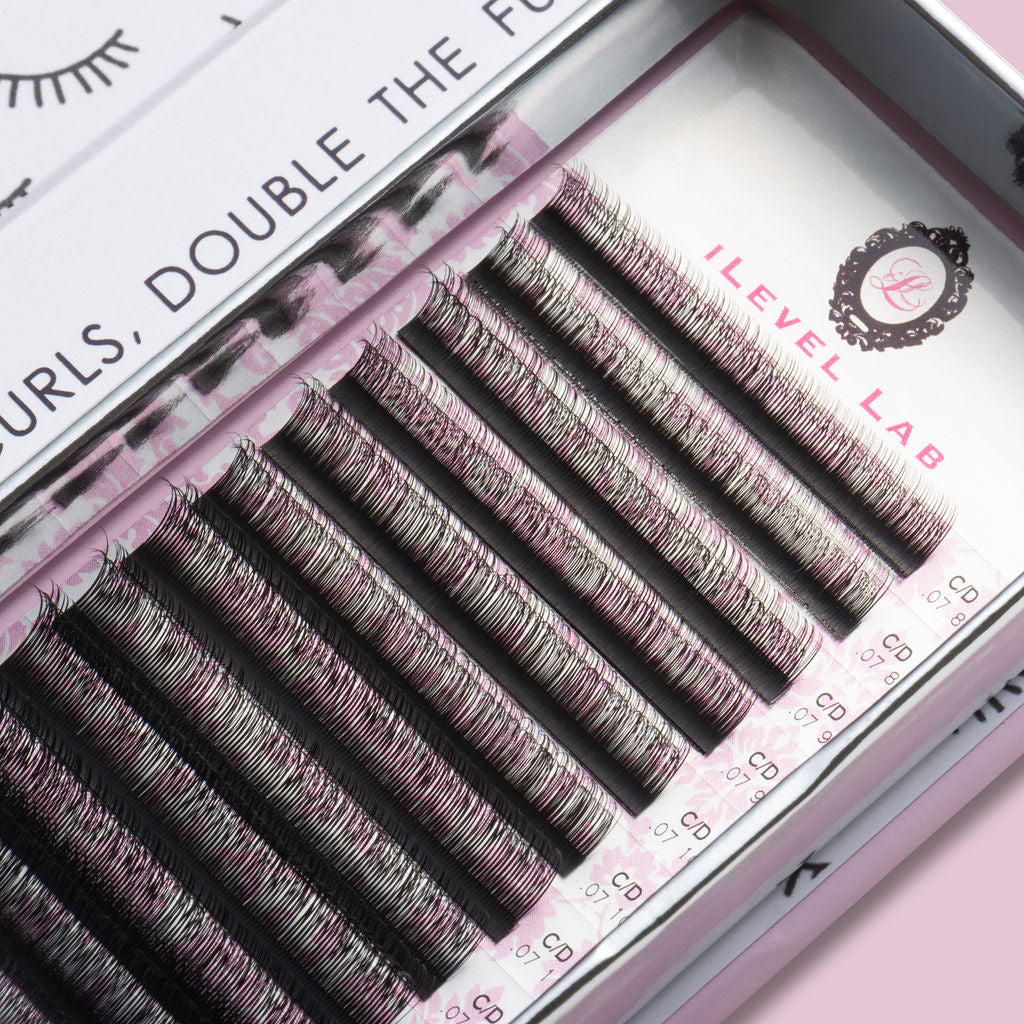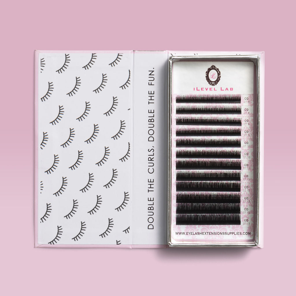 iLevel Lab DOUBLE LAYER Volume Lashes C and D Curl mixed on one row are perfect for creating dramatic looking fans. Each row has 2 different curls giving lashes a fluffy dramatic look. These are not pre made fans! This product is for ADVANCED lash techs that mastered the volume by hand technique. Each row comes on a sticker that can be put on your work area so you can work efficiently, and more quickly.