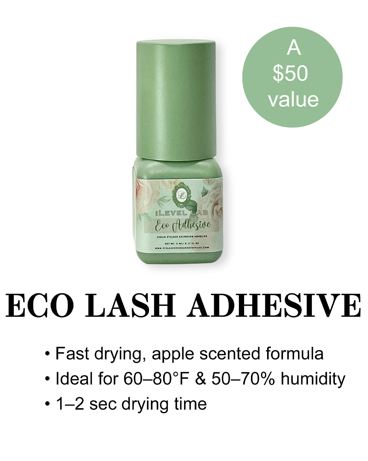 Eco Lash Adhesive – Eco Lash Adhesive is our rebranded vegan adhesive, now with a refreshing apple scent, designed for classic and volume lash extensions. $50 VALUE
