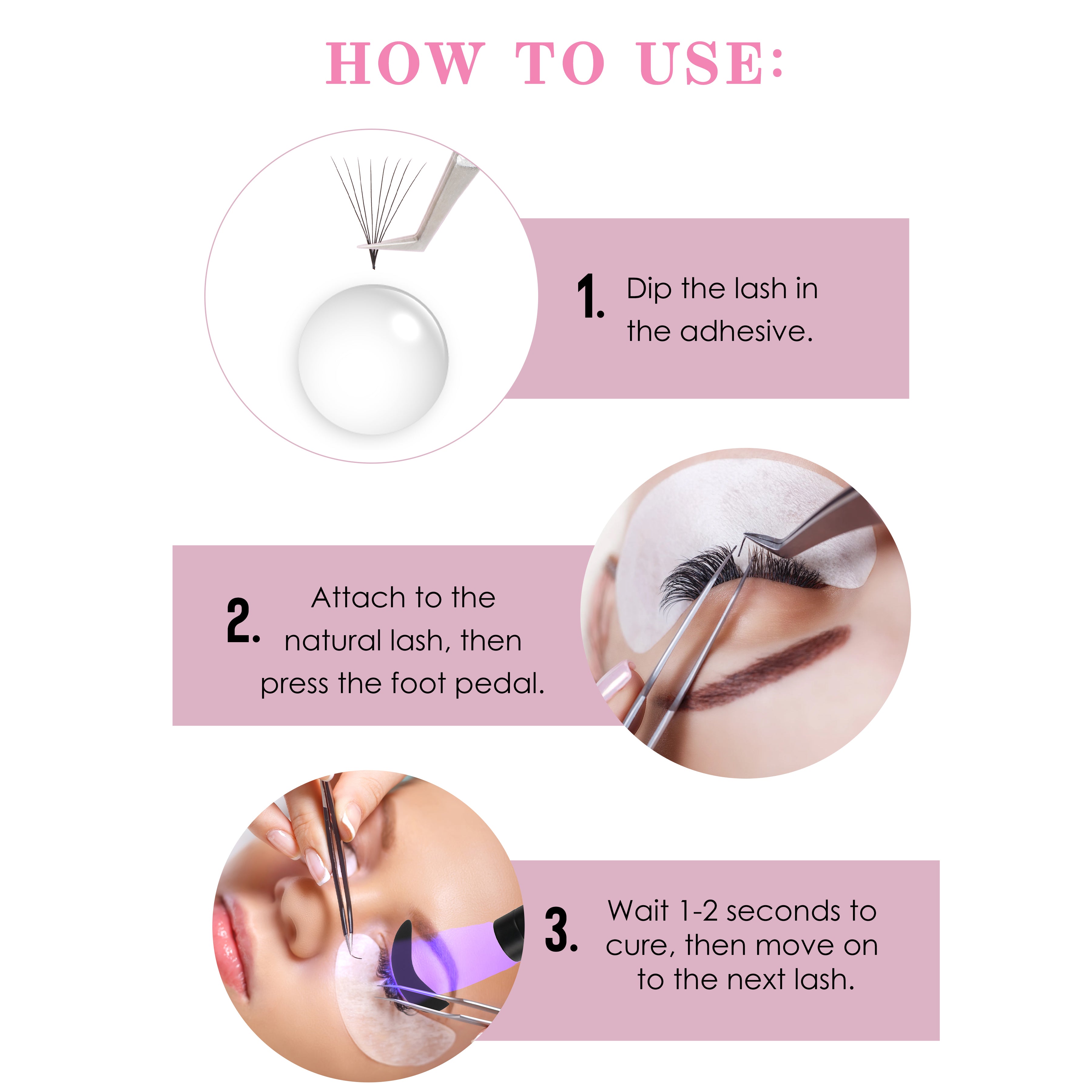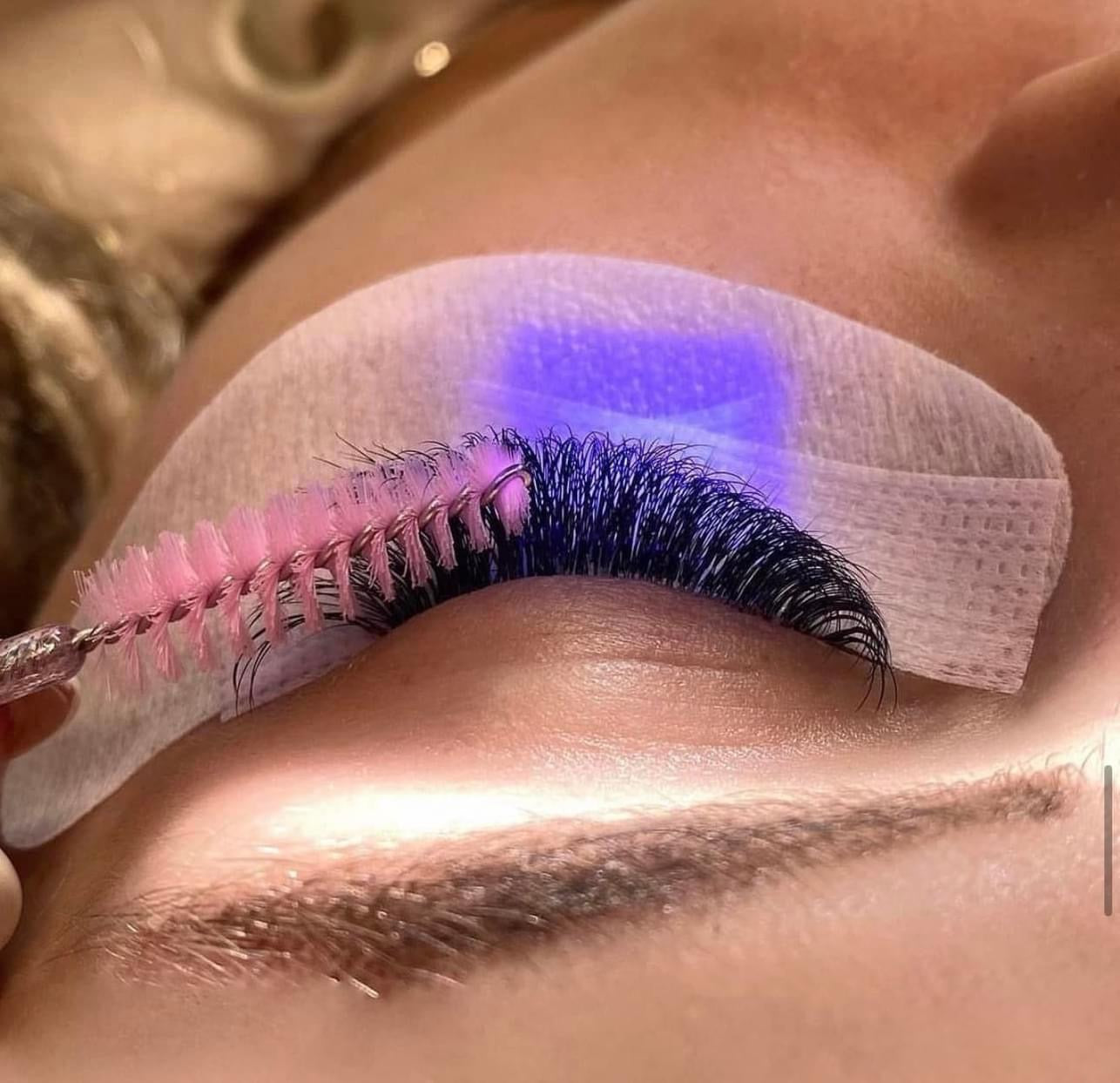 - Use protective eye care. Lash artist should wear protective glasses. The lash client should have black silicone pads cover the eyelids during application.